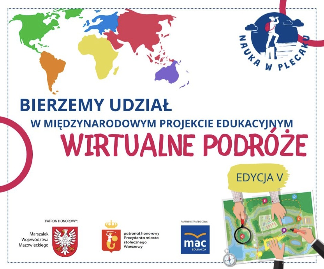 Klasa 3a i 3b bierze udział w 5 edycji projektu Wirtualne Podróże. Projekt ma na celu pobudzenie aktywności poznawczej dzieci poprzez udział we wspólnych działaniach. Zachęcić do zdobywania wiedzy o świecie i świadomego podróżowania. Jego integralną częścia jest uczestnictwo w lekcjach na żywo, w czasie których organizatrka dzieli się autentycznymi doświadczeniami z podróży po świecie.
