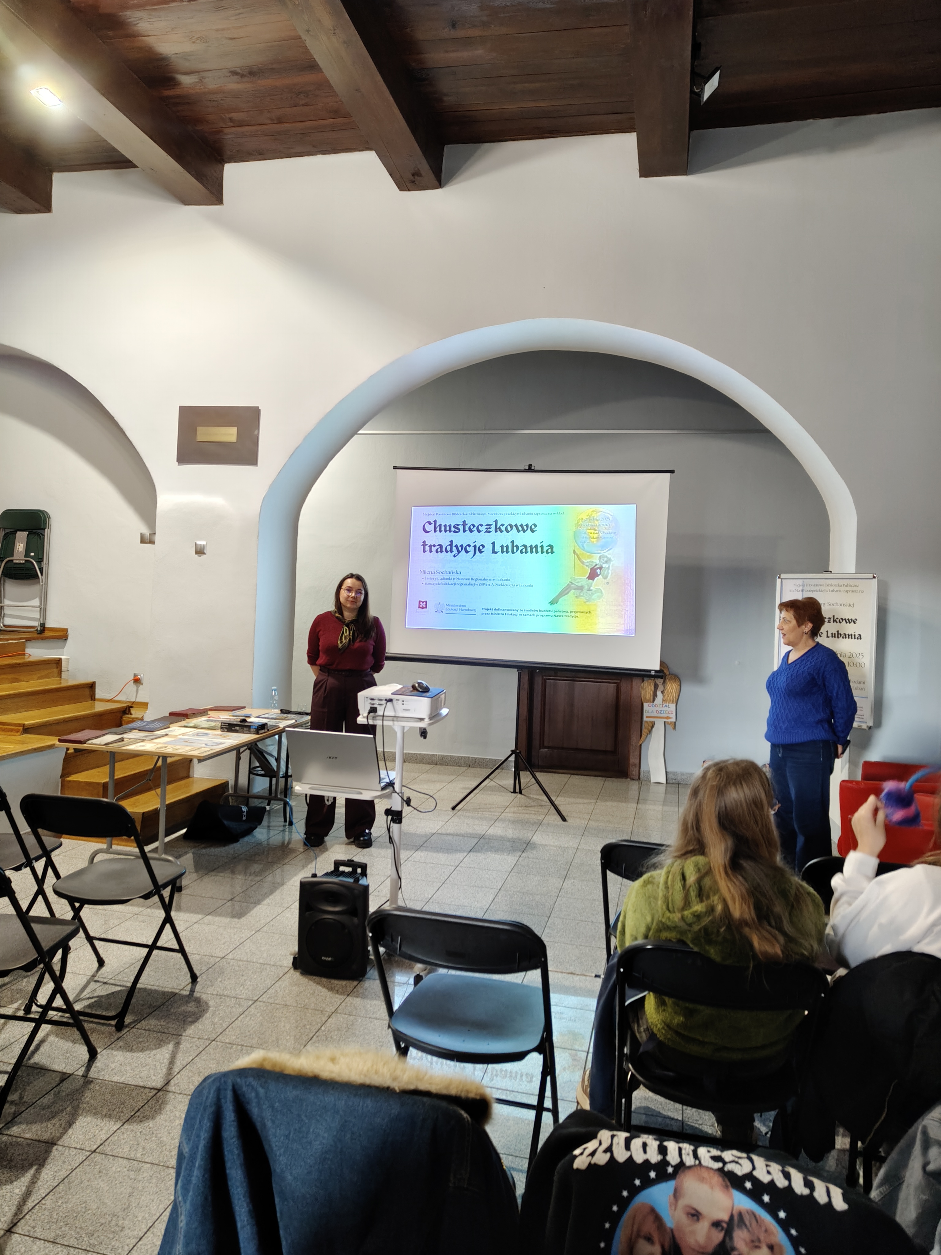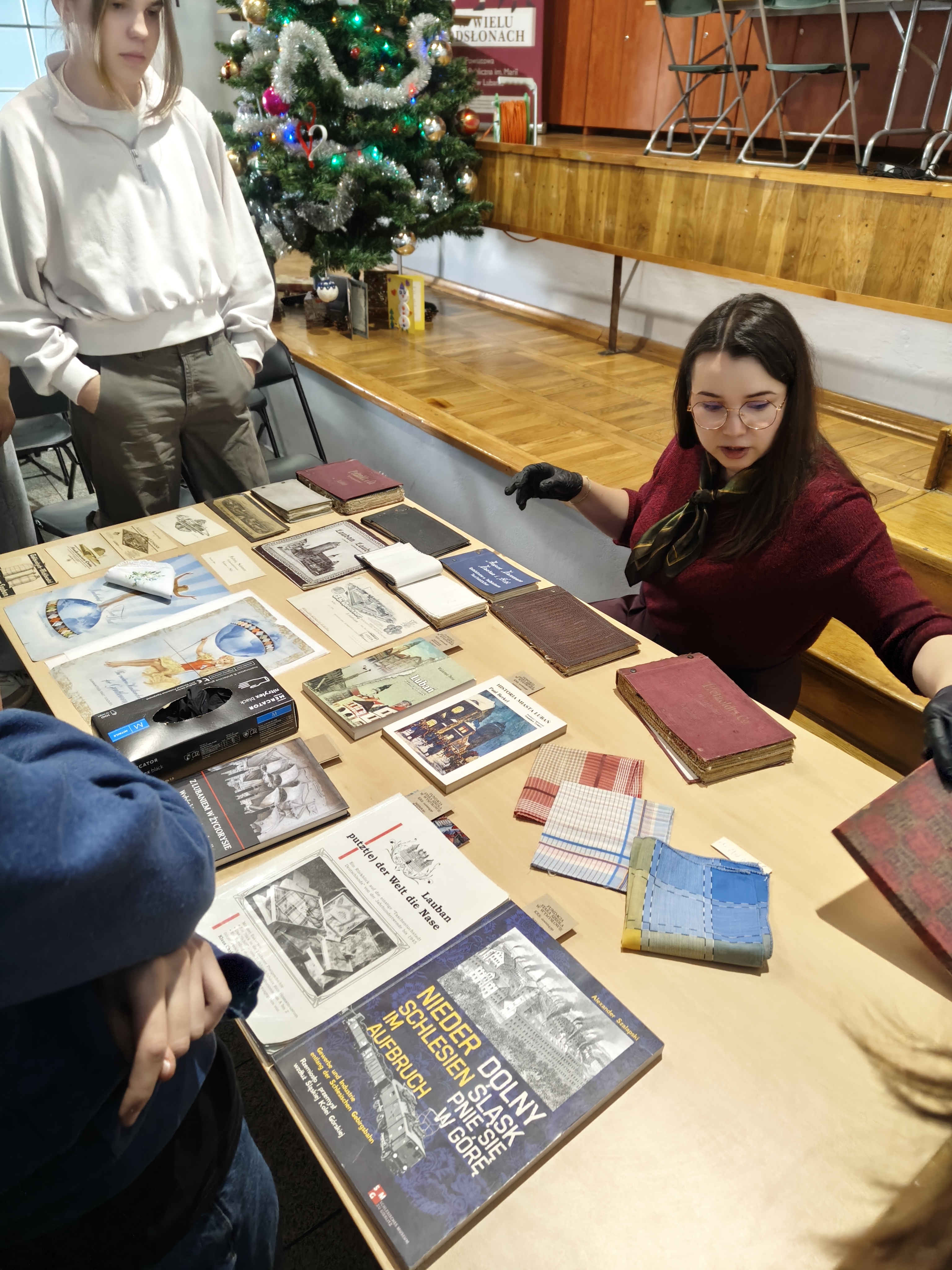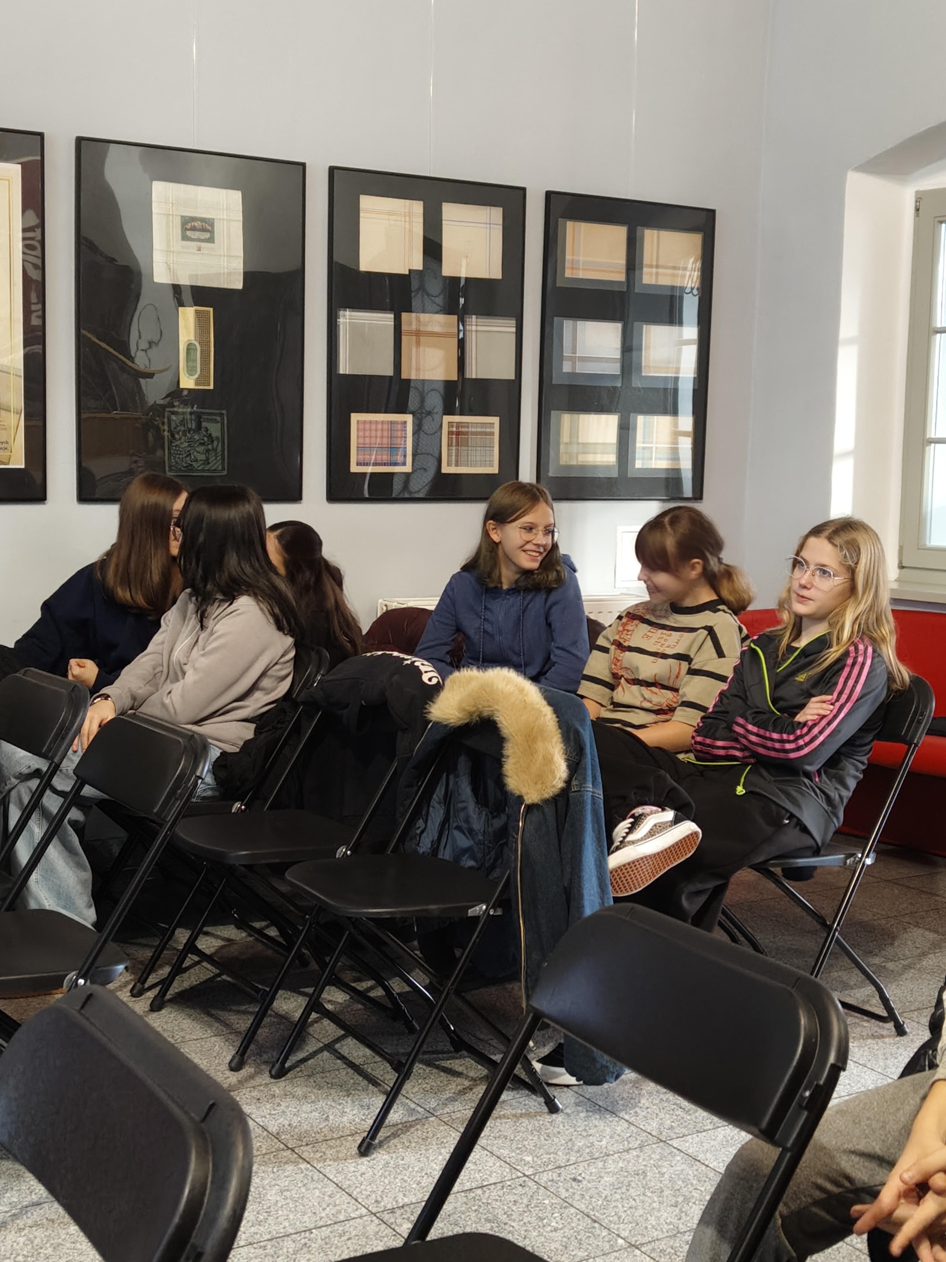 Prowadząca wykład zaprezentowała również archiwalne fotografie, przykładowe wzory dawnych chusteczek oraz opowiedział o ich eksporcie, technikach tkackich i znaczeniu gospodarczym dla mieszkańców regionu. Uczniowie mieli możliwość zobaczyć, jak wyglądały dawne tkalnie i warsztaty oraz zrozumieć, jak produkcja chusteczek wpływała na rozwój lokalnej społeczności.