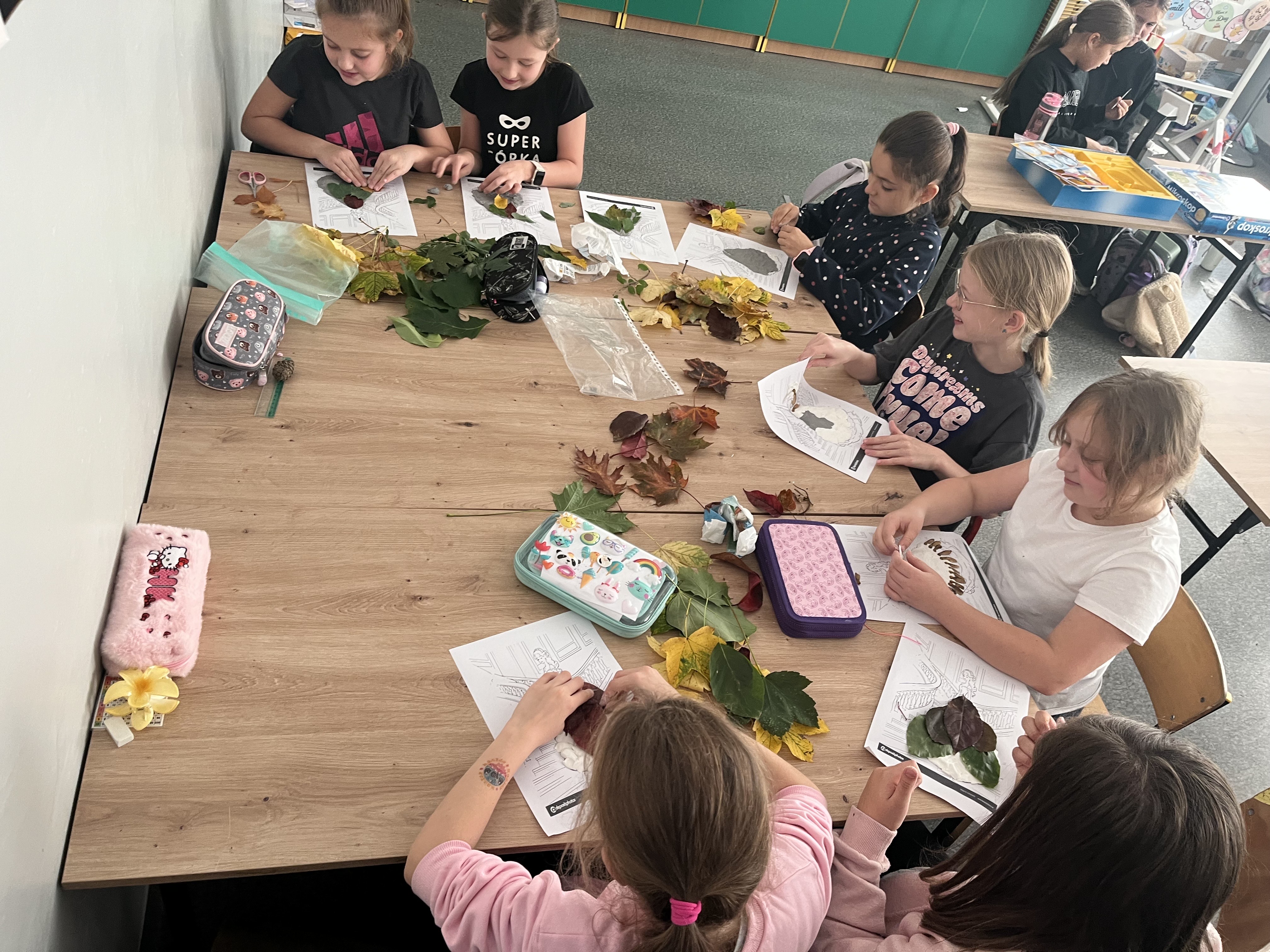 Na zajęciach koła plastycznego uczniowie rozwijają swoją kreatywność i wyobraźnię poprzez różnorodne techniki artystyczne. Dzieci tworzą prace z wykorzystaniem darów natury – kolorowych liści, lepią z gliny, poznają tajniki origami, a także konstruują szpatułki i figurki z patyczków. Każde spotkanie to okazja do odkrywania nowych sposobów wyrażania siebie, pracy w skupieniu, ale też świetnej zabawy.