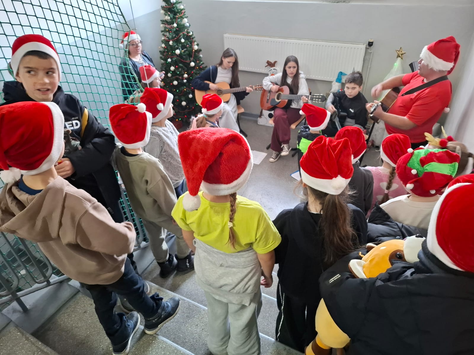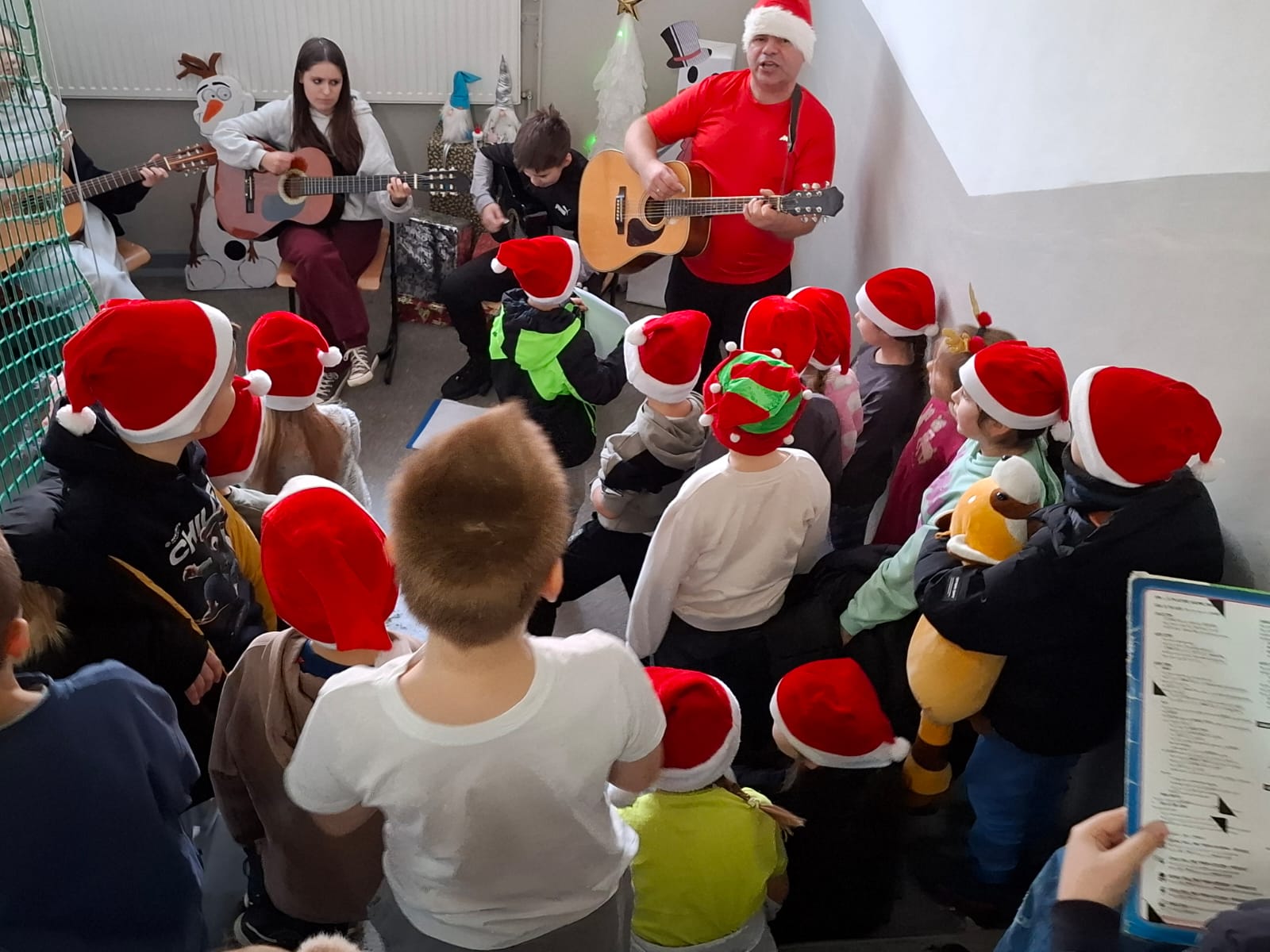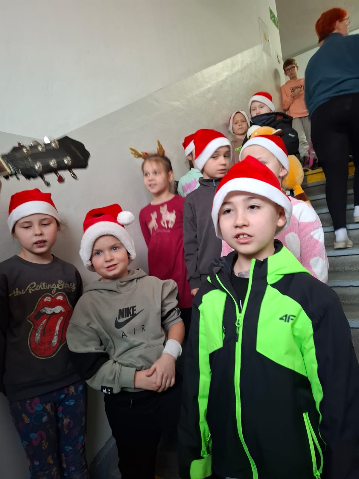 W środę 17.12.2025 r. podczas długiej przerwy w naszej szkole rozbrzmiewały polskie kolędy. Dzięki akompaniamentowi i śpiewowi Kółka Gitarowego pana Jarka Mleczaka oraz Zespołu Artystycznego mogliśmy wspólnie kolędować – zarówno z najmłodszymi uczniami, jak i ze starszymi, którzy chętnie dołączyli do śpiewania.
