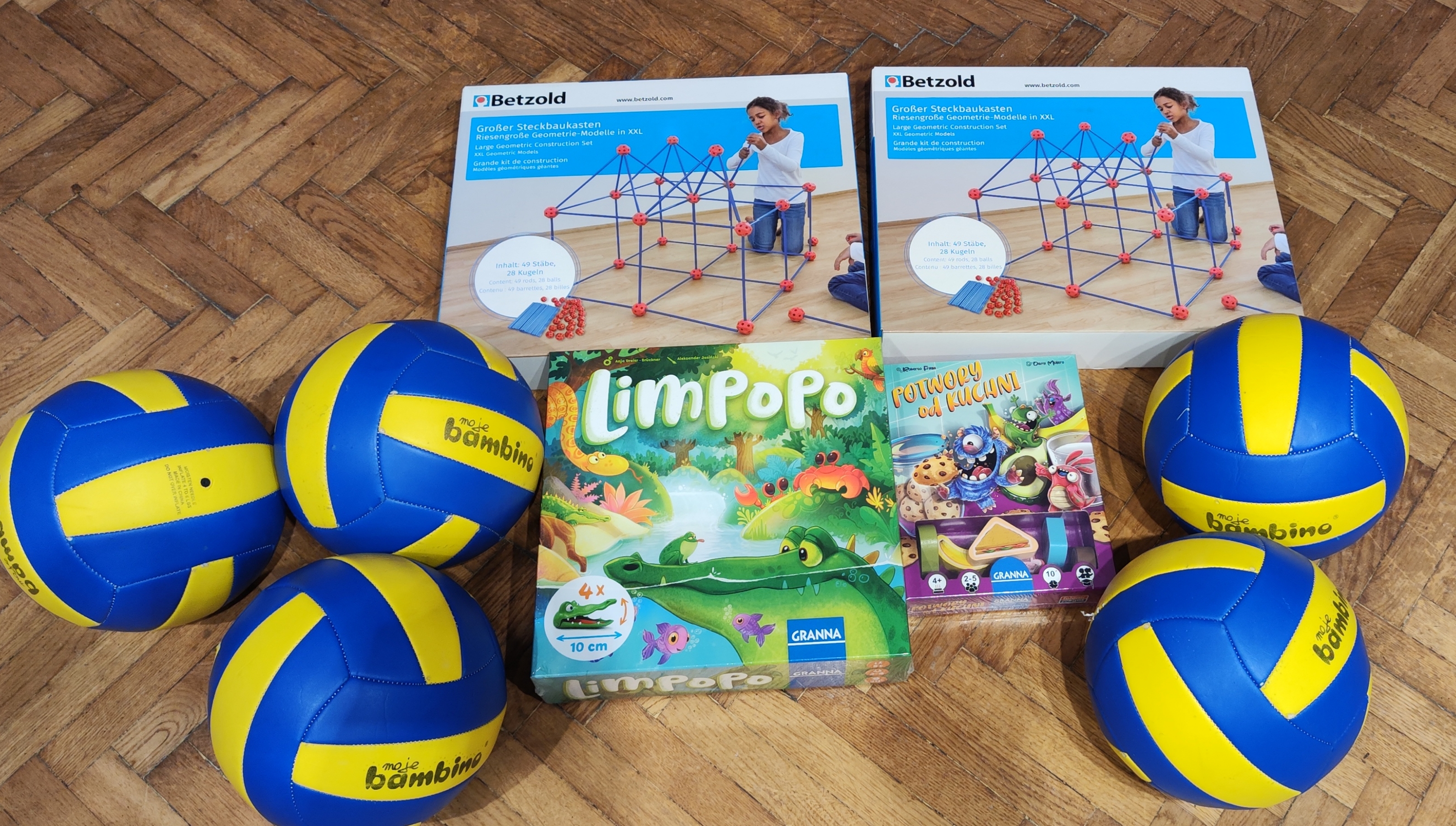 Z radością informujemy, że zestaw gier, piłki oraz zestaw konstrukcyjny już do nas dotarły. Pozostałe nagrody są w drodze – z niecierpliwością czekamy na ich dostarczenie.