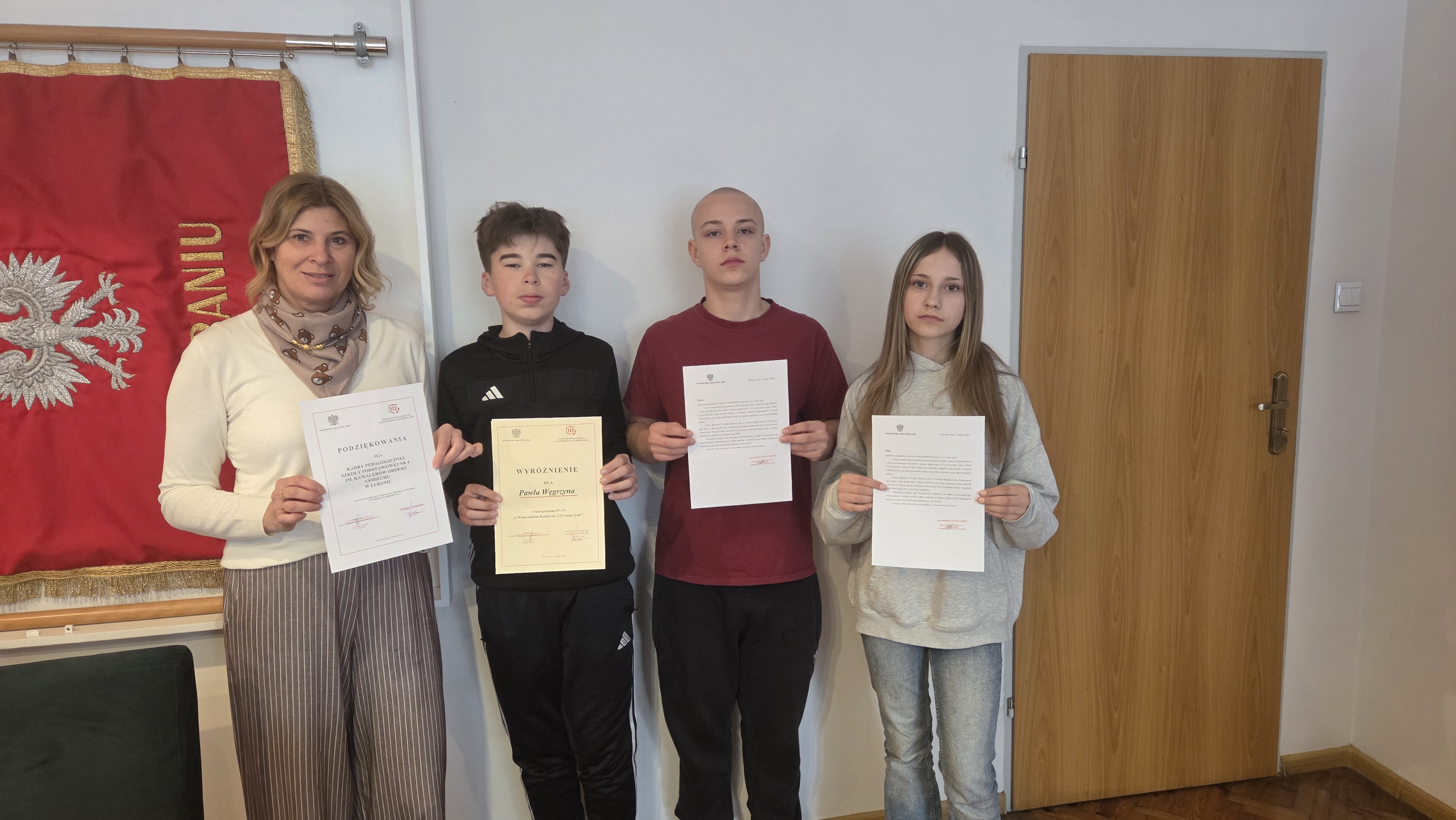 W dniu dzisiejszym nasi uczniowie – Maja Oprzędek, Piotr Oprzędek oraz Paweł Węgrzyn – którzy z zaangażowaniem wzięli udział w Wojewódzkim Konkursie „112 ratuje życie”, zostali uhonorowani wyjątkowym wyróżnieniem. Otrzymali oni listy gratulacyjne od Wojewody Dolnośląskiego, w których podkreślono, jak ogromne znaczenie ma świadomość społeczna dotycząca numeru alarmowego 112 oraz jak cenna jest gotowość do niesienia pomocy drugiemu człowiekowi. Szczególne słowa uznania skierowano do Pawła, który za swoją pracę otrzymał również Dyplom Wyróżnienia.