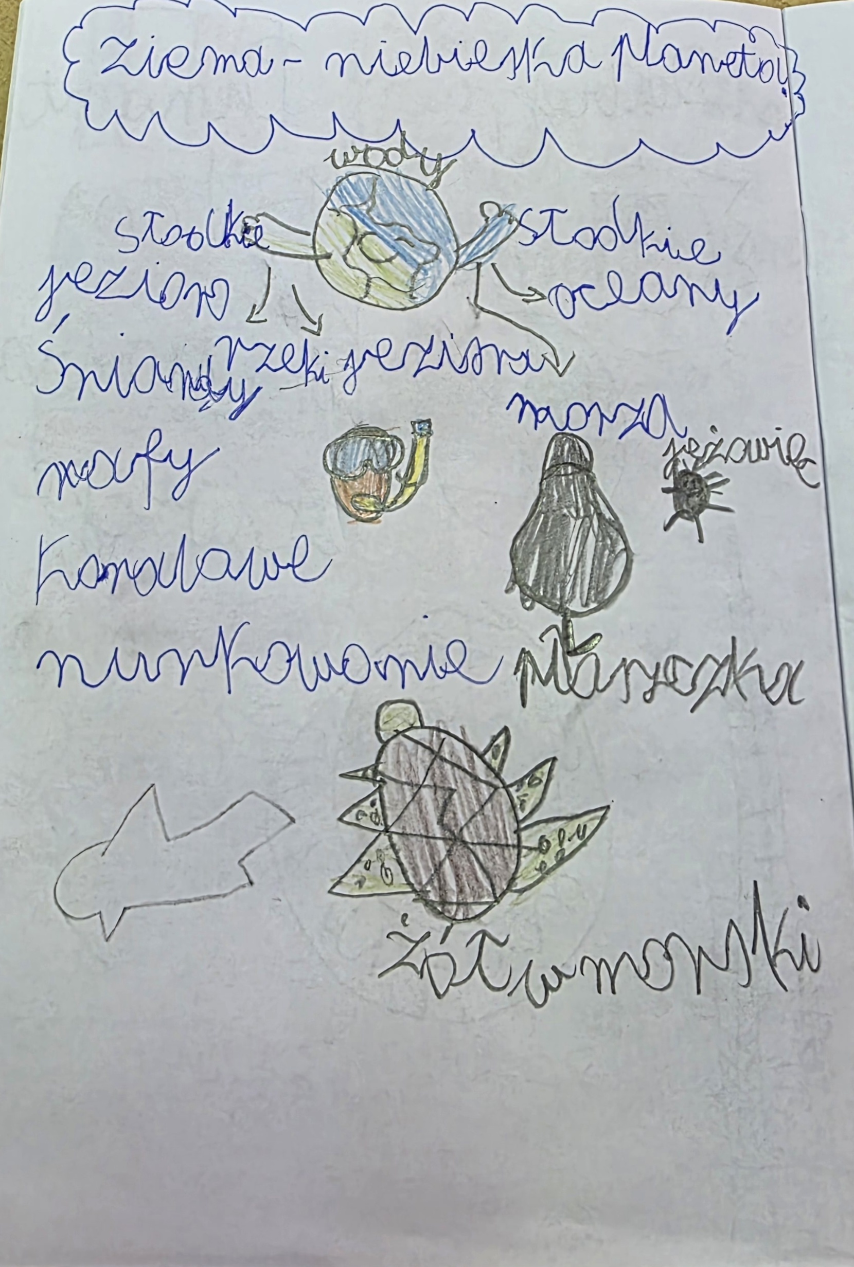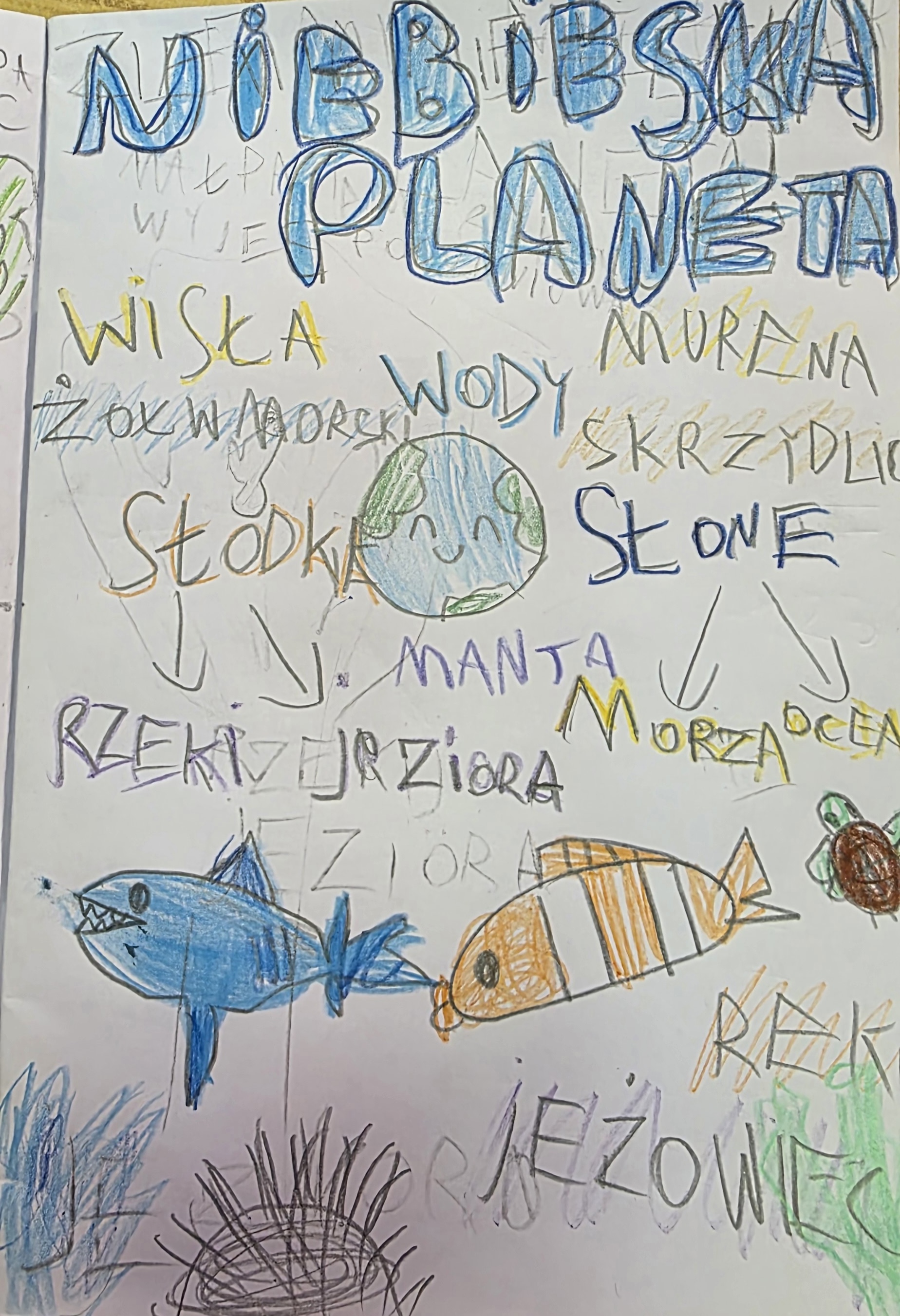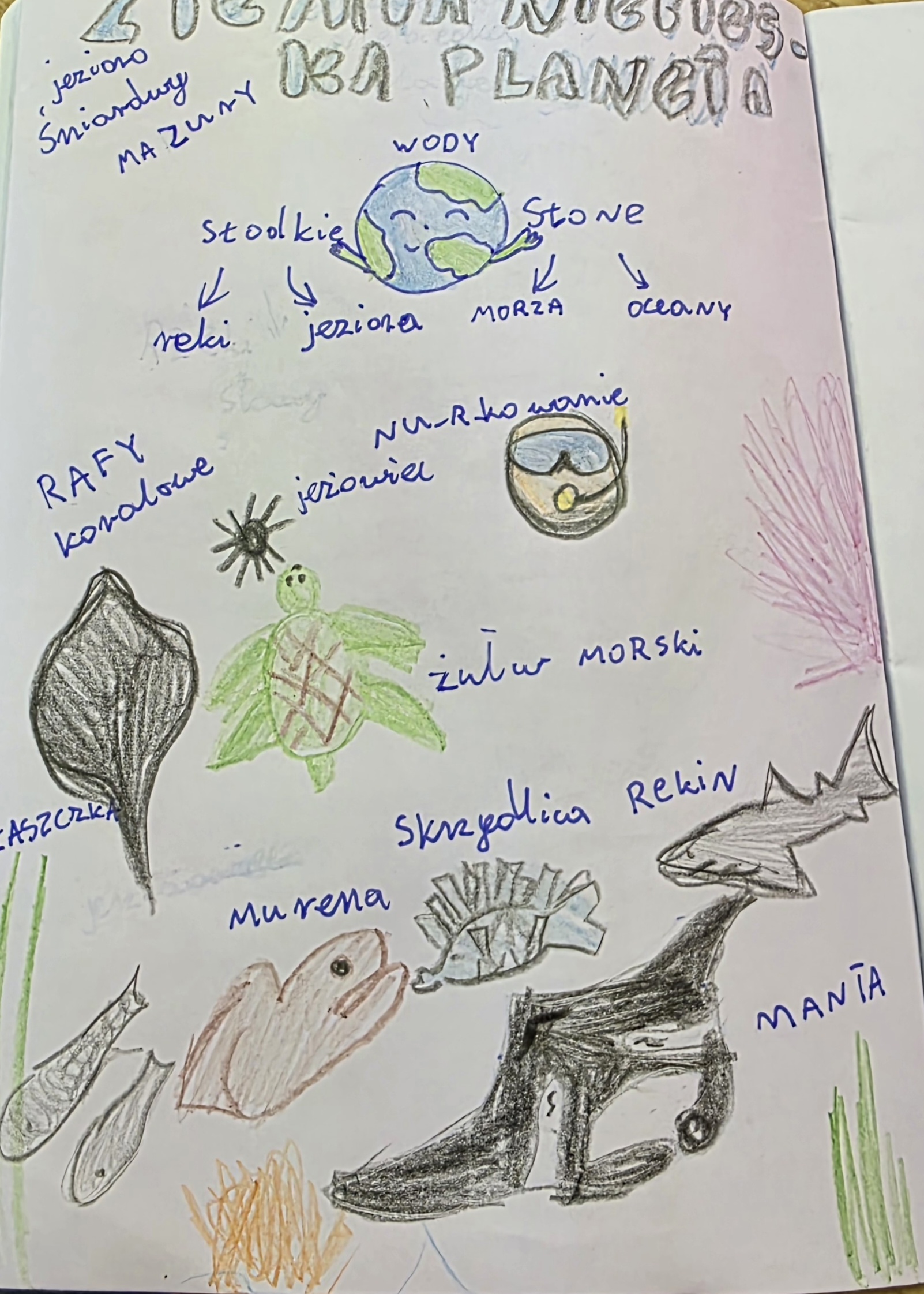 Lekcja była bardzo ciekawa, trzecioklasiści zdobyli wiele cennych informacji, a także wykonali prace przedstawiające podwodny świat, wykazując się dużą wyobraźnią i kreatywnością.