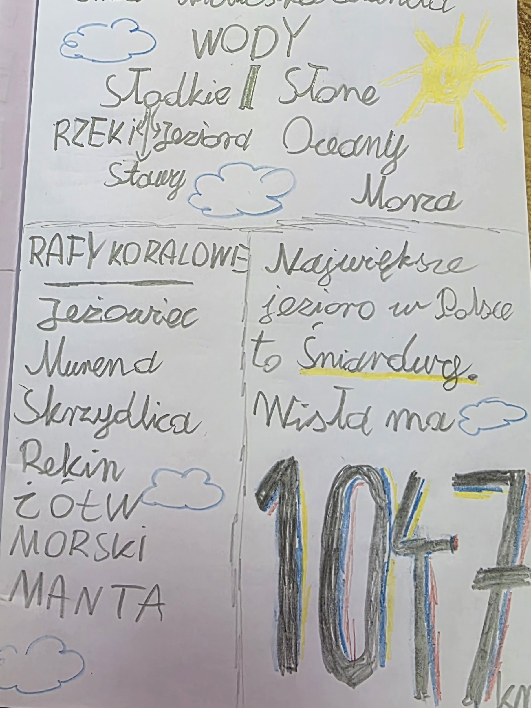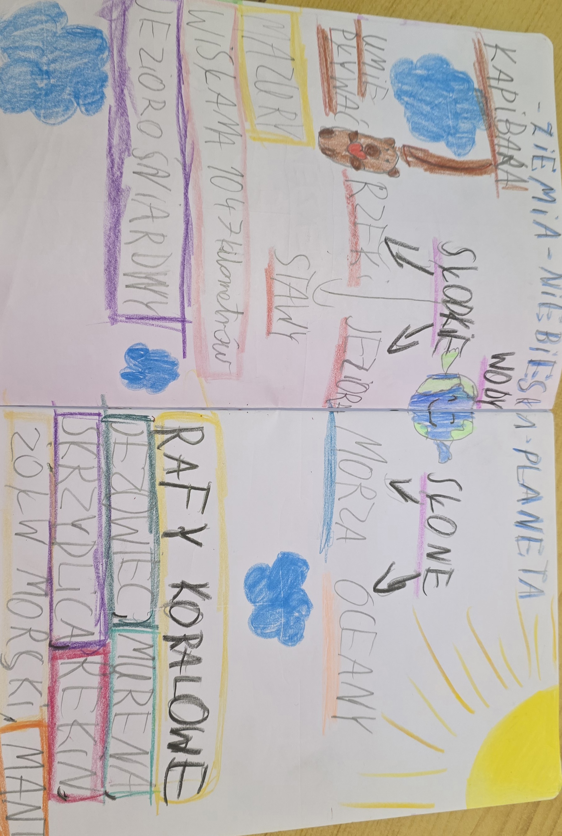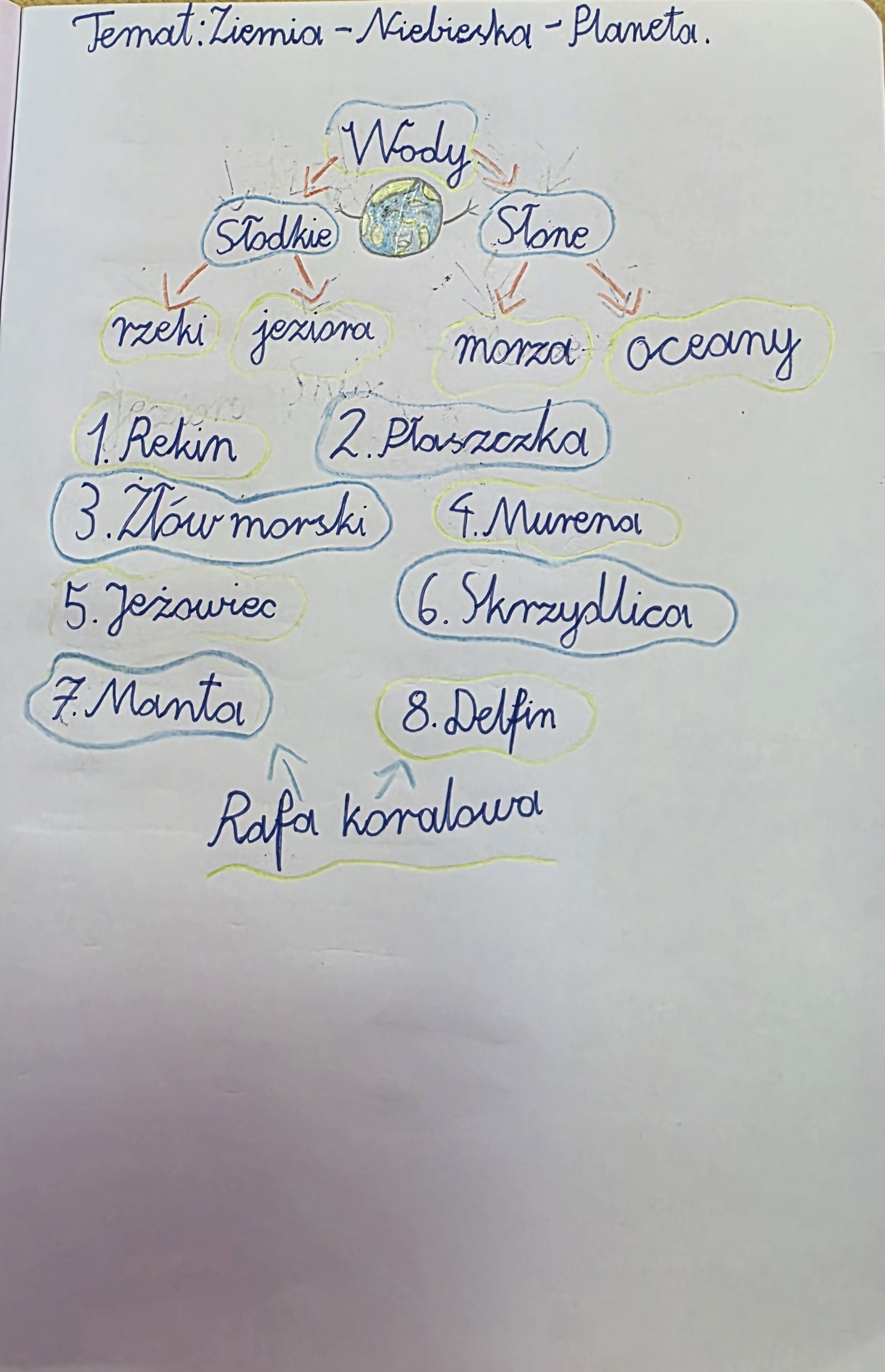 Lekcja była bardzo ciekawa, trzecioklasiści zdobyli wiele cennych informacji, a także wykonali prace przedstawiające podwodny świat, wykazując się dużą wyobraźnią i kreatywnością.